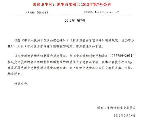記者獲悉,國家衛(wèi)生和計劃生育委員會于2013年5月20日發(fā)布2013年第7號公告:“以可食用的動物或植物蛋白質(zhì)原料,經(jīng)《食品添加劑使用標(biāo)準(zhǔn)》(GB2760-011)規(guī)定允許使用的食物用酶制劑酶解制成的物質(zhì)作為普通食品管理。自本公告發(fā)布之日起,我委不再受理上述物質(zhì)新資源食品的申請。生產(chǎn)經(jīng)營上述食品應(yīng)當(dāng)符合有關(guān)法律、法規(guī)、標(biāo)準(zhǔn)規(guī)定?!倍z原蛋白就是以動物皮、骨制成的蛋白質(zhì)原料,經(jīng)酶解制成的物質(zhì),以前須向國家衛(wèi)生部申報“新資源食品”,本公告發(fā)布后,所有食品均可添加膠原蛋白,也就是說:在中國以膠原蛋白為原料生產(chǎn)的任何膠原蛋白產(chǎn)品都是合法的。