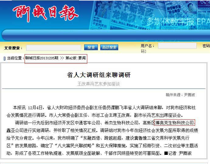 12月4日,省人大調(diào)研組來(lái)聊調(diào)研。期間重點(diǎn)來(lái)到了山東博奧克生物科技有限公司,聽(tīng)取了相關(guān)情況匯報(bào)。博奧克再度成為聊城日?qǐng)?bào)等媒體爭(zhēng)相報(bào)道的聚焦點(diǎn)。以下為聊城日?qǐng)?bào)報(bào)道全文: